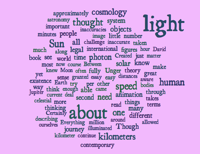 I first came across this animation about 2 months ago. Created by Alphonse Swinehart, the animation depicts the journey of a photon of light. The 45 minute clip shows a photon beginning its journey from the surface of the Sun, till it passes Jupiter. It is pretty tough, to try to make sense of some of the distances involved. Needless to say, these encounters with astronomy raise a number of provocations regarding human senses of time and cosmology. (Note on numbers: The figures I have chosen are taken from other websites. The figures may be slightly inaccurate, and I am aware that I may not fully understand all of them. Let alone, be able to verify them independently. Though, I suspect it would not matter too much.)